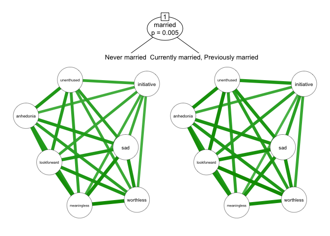 networktree can be used to identify if this depression network is heterogeneous depending on the sample characteristics. For instance, we can test whether the network differs depending on participants’ marital status.